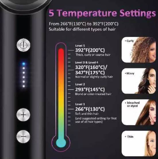 5 faixas de temperatura: 130ºC, para cabelos macios e finos, 150ºC, para cabelos finos ou descoloridos, 170ºC, para cabelos tingidos ou de cor escura 180ºC, para cabelos normais ou ligeiramente encaracolados e 200 ° , para cabelos grossos, cacheados e ondulados.