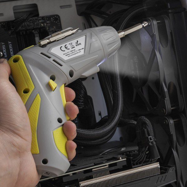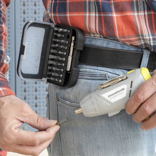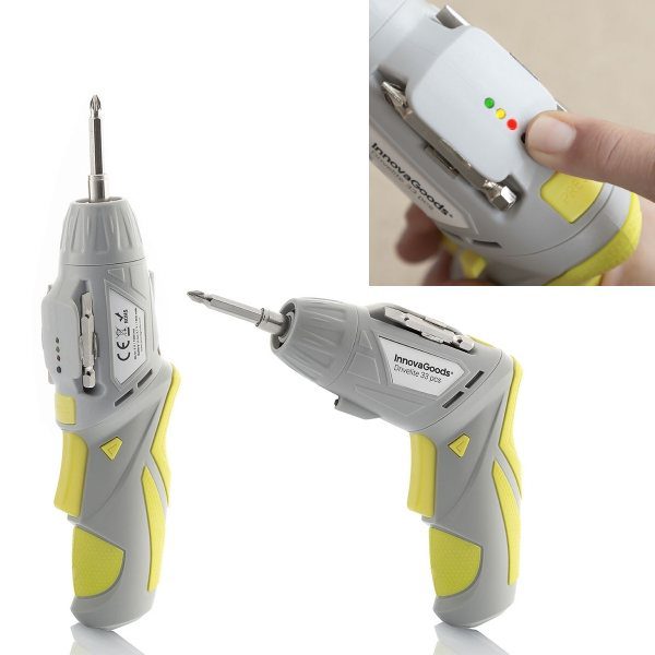 Um completo conjunto de aparafusadora elétrica com acessórios e um original design multiposição que se adapta melhor a todos os espaços, uma vez que permite duas posições: totalmente reto (180º) ou tipo pistola (90º). Também inclui uma luz LED para iluminar a área de trabalho e inclui estojo com pinça se suporte para o cinto e 33 acessórios: 30 pontas, 1 extensor e 2 pontas de ação rápida (estrela e plana). Permite selecionar o sentido de rotação com os botões laterais (esquerda-direita) e, como não tem fios, é muito mais fácil de usar, sem necessidade de ter uma tomada por perto. Tem um botão para ver o estado da bateria em qualquer momento, através de três LED de cores diferentes (verde: carga completa; laranja: carga média; vermelho: carga fraca).