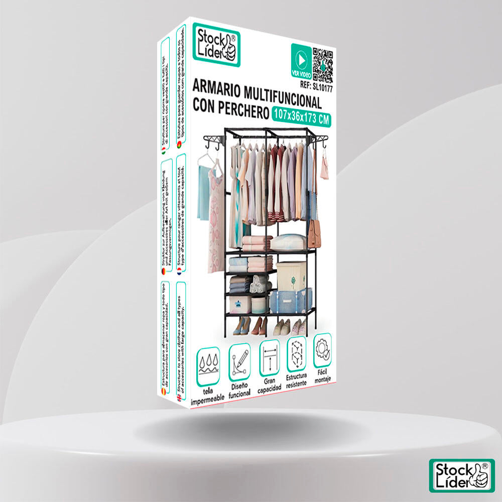O armário multifuncional com cabideiro é a solução ideal para quem precisa de mais espaço de arrumação de forma prática, leve e versátil. Perfeito para organizar roupas, sapatos, malas, caixas e acessórios, combina prateleiras com espaço para pendurar peças longas, oferecendo assim um armazenamento completo.