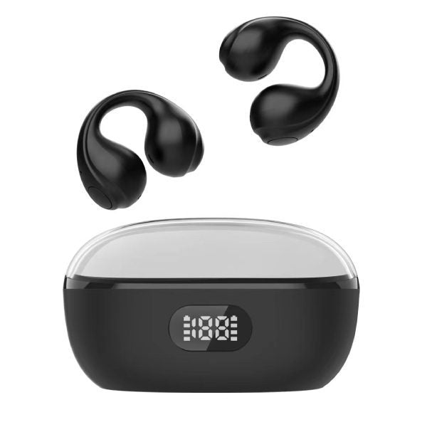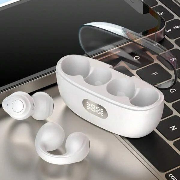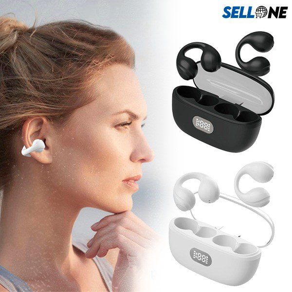 Auriculares Bluetooth sem fios que não precisam de ser inseridos no canal auditivo, são pendurados diretamente no ouvido.