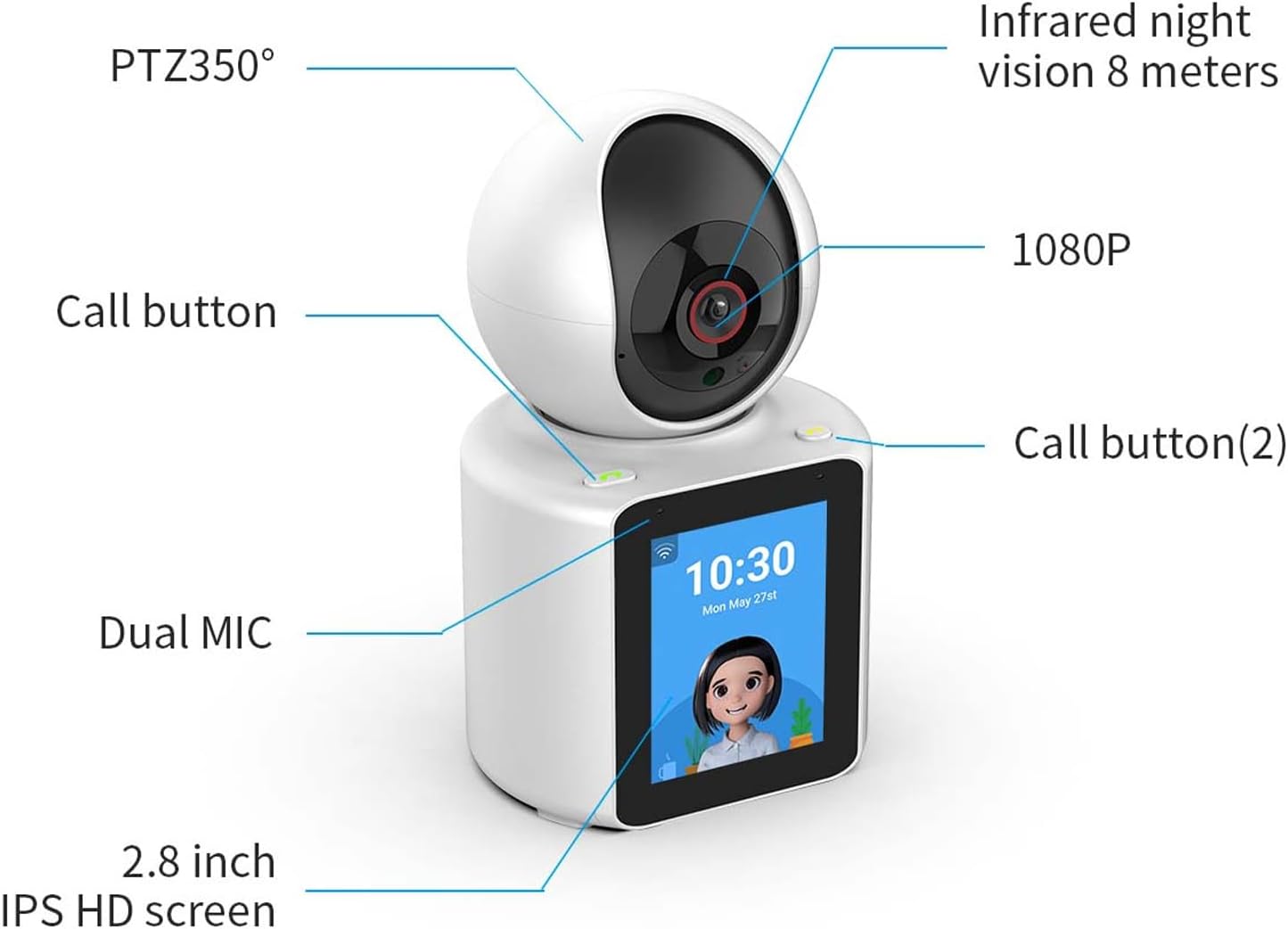Câmara interna ideal para idosos, equipada com um ecrã IPS de 2,8 polegadas e monitor de bebé com microfone duplo. Uma solução completa de segurança residencial inteligente, com função de despertador por voz.