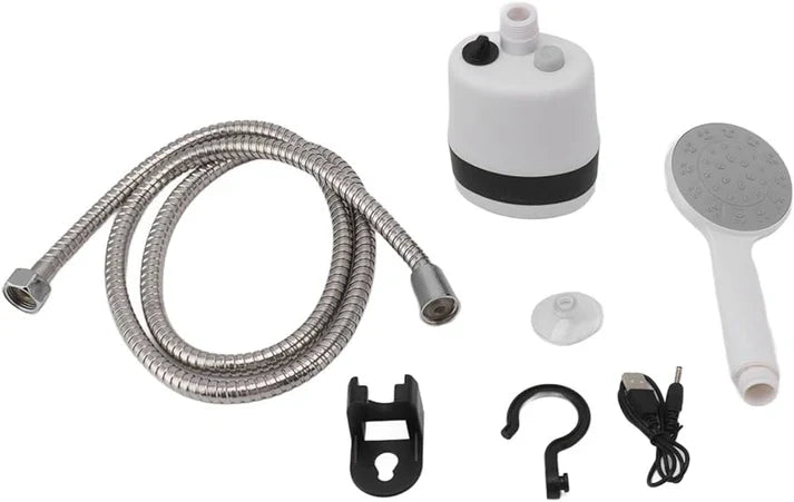 O chuveiro vem com um tubo de 1,5m para facilitar o movimento, e inclui uma ventosa e um gancho para pendurar em árvores ou superfícies lisas, como janelas de vidro ou para-brisas de carro, proporcionando uma experiência de banho hands-free. A potente bateria de íons de lítio de 2200mAh oferece até 2 horas de autonomia após uma carga completa, garantindo um uso prolongado e sem preocupações.