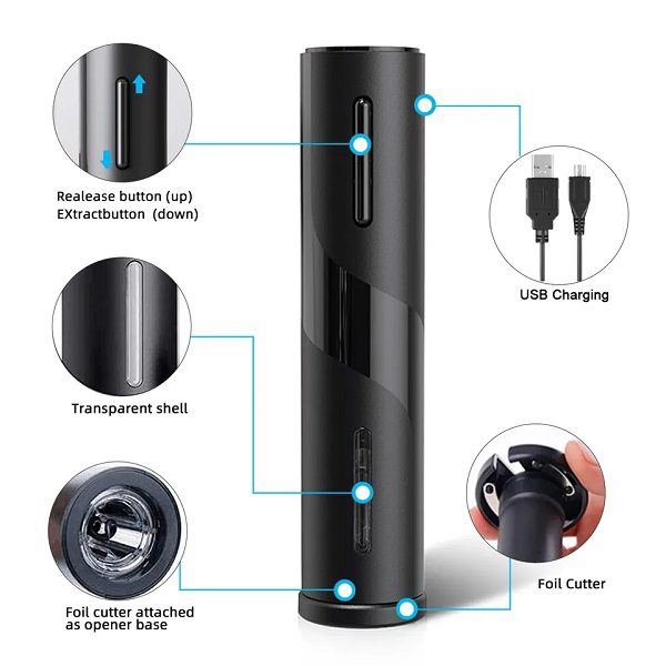 - Saca-Rolhas Elétrico: Este moderno saca-rolhas elétrico permite abrir suas garrafas de vinho com o simples toque de um botão. Basta posicionar o dispositivo sobre a garrafa, pressionar o botão e assistir o saca-rolhas fazer todo o trabalho por você.