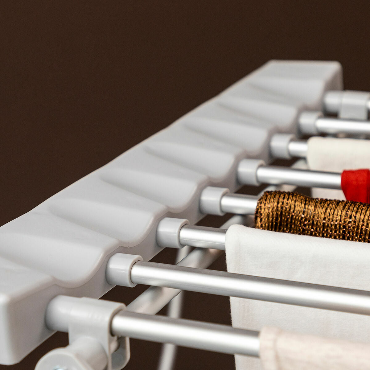 - 8 Barras aquecidas: o nosso estendal elétrico conta com 8 barras que aquecem para secar a roupa mais rapidamente, o que é muito útil no inverno. As suas barras de secagem oferecem uma grande superfície de estendal. Este estendal elétrico é adequado para todo o tipo de roupas e suporta um máximo de 12 kg.
