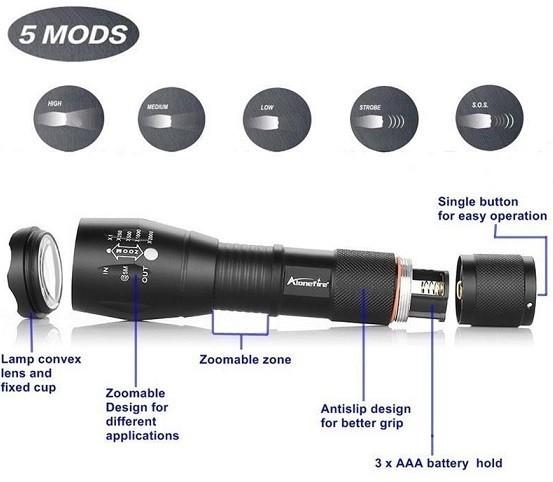 Desfrute a sua alta potência super brilhante que pode ser visto a quilómetros de distância. A função de focagem irá permitir-lhe ajustar a largura que pretende o seu feixe.
