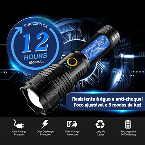 A lanterna led recarregável adota bateria recarregável 6800mAh 18650, em comparação com outras baterias, a sua energia de descarga é 50% maior, durando até 12 horas.