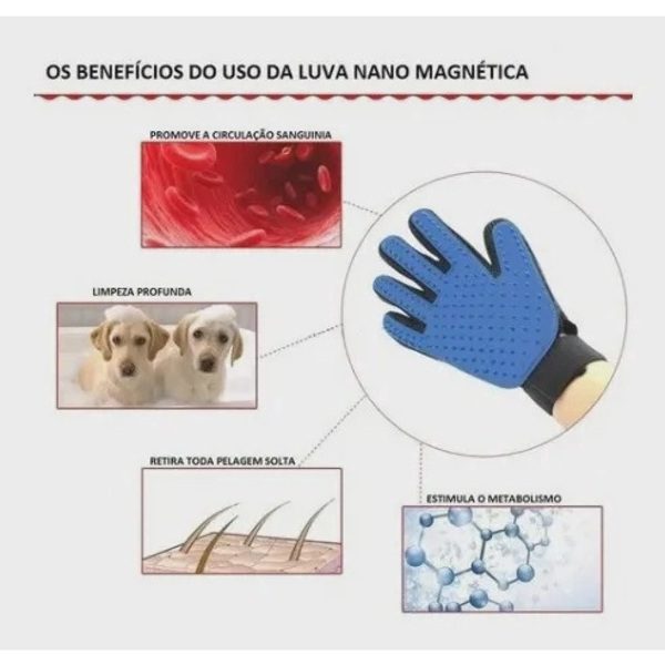 Esta luva para os seus animais de estimação pode relaxar enquanto acaricia seu amigo e remover o excesso de pelo. Ao contrário dos pincéis e luvas tradicionais, com a luva magnética o seu animal de estimação não vai ter medo ou tentar fugir, é muito mais fácil cuidar do seu pelo, e consequentemente não terá pelos espalhadas pela casa.