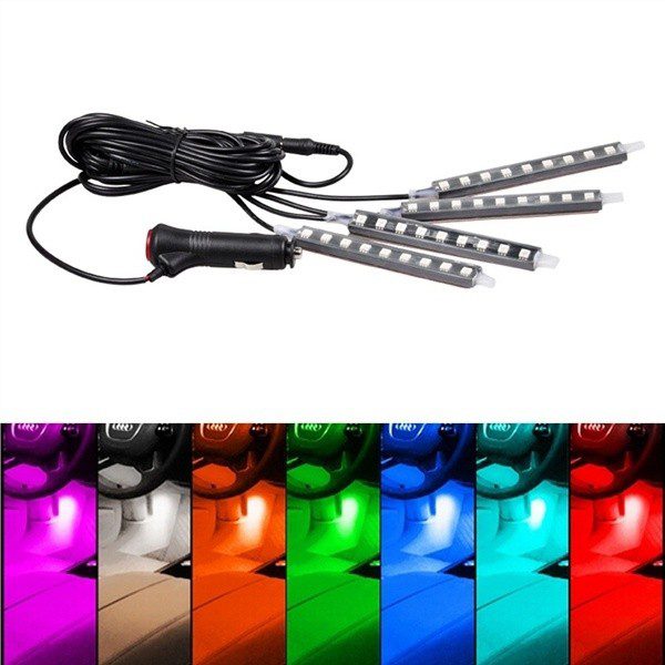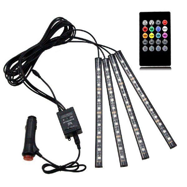 Luz LED para carro com quatro faixas de 12 LEDs cada, cor RGB, com controlo remoto sem fios e carregador para ligação ao isqueiro do carro. incluído.
