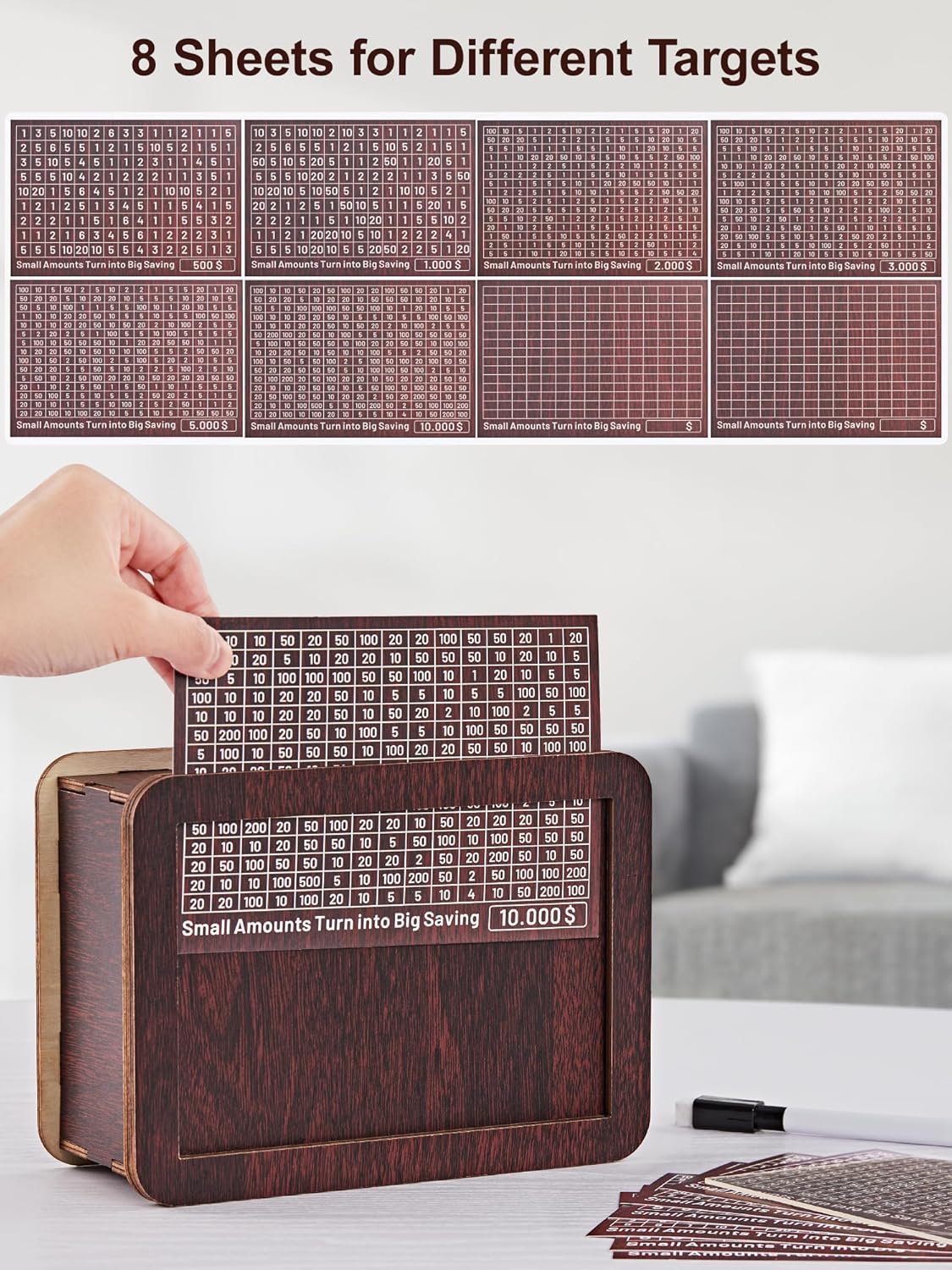 Transforme a sua poupança numa experiência mais organizada e motivadora com este elegante mealheiro de madeira. Com um design moderno e resistente, este mealheiro permite-lhe definir os seus objetivos financeiros de forma visual, escrevendo o valor desejado no quadro acrílico e atualizando à medida que poupa.