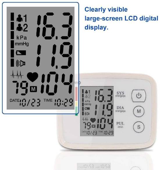 Mostra claramente sistólica, diastólica, frequência cardíaca, data, hora e utilizador. -