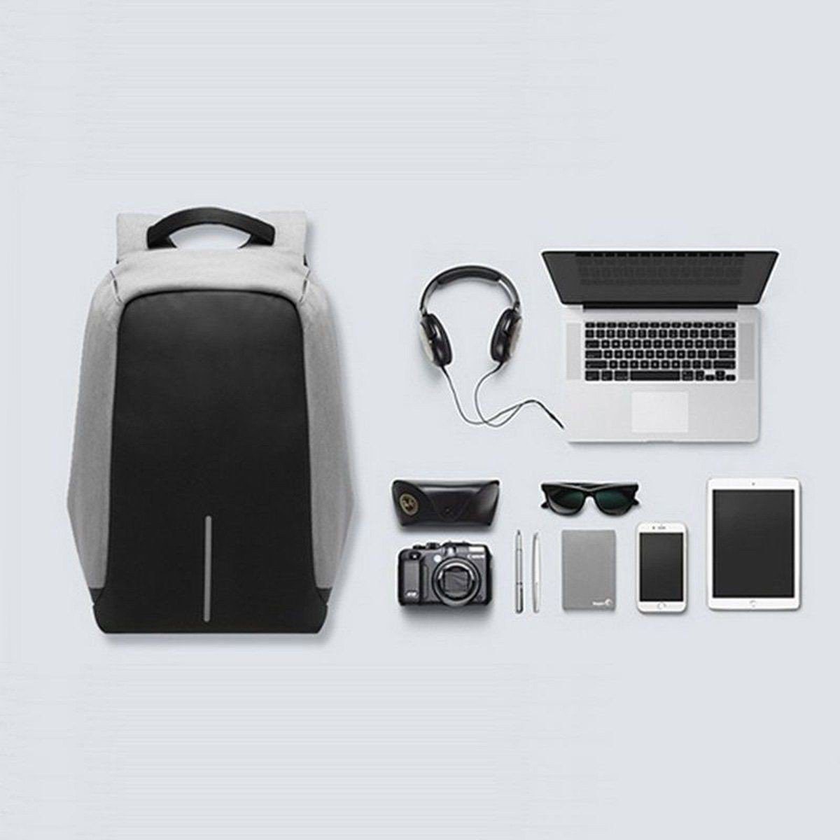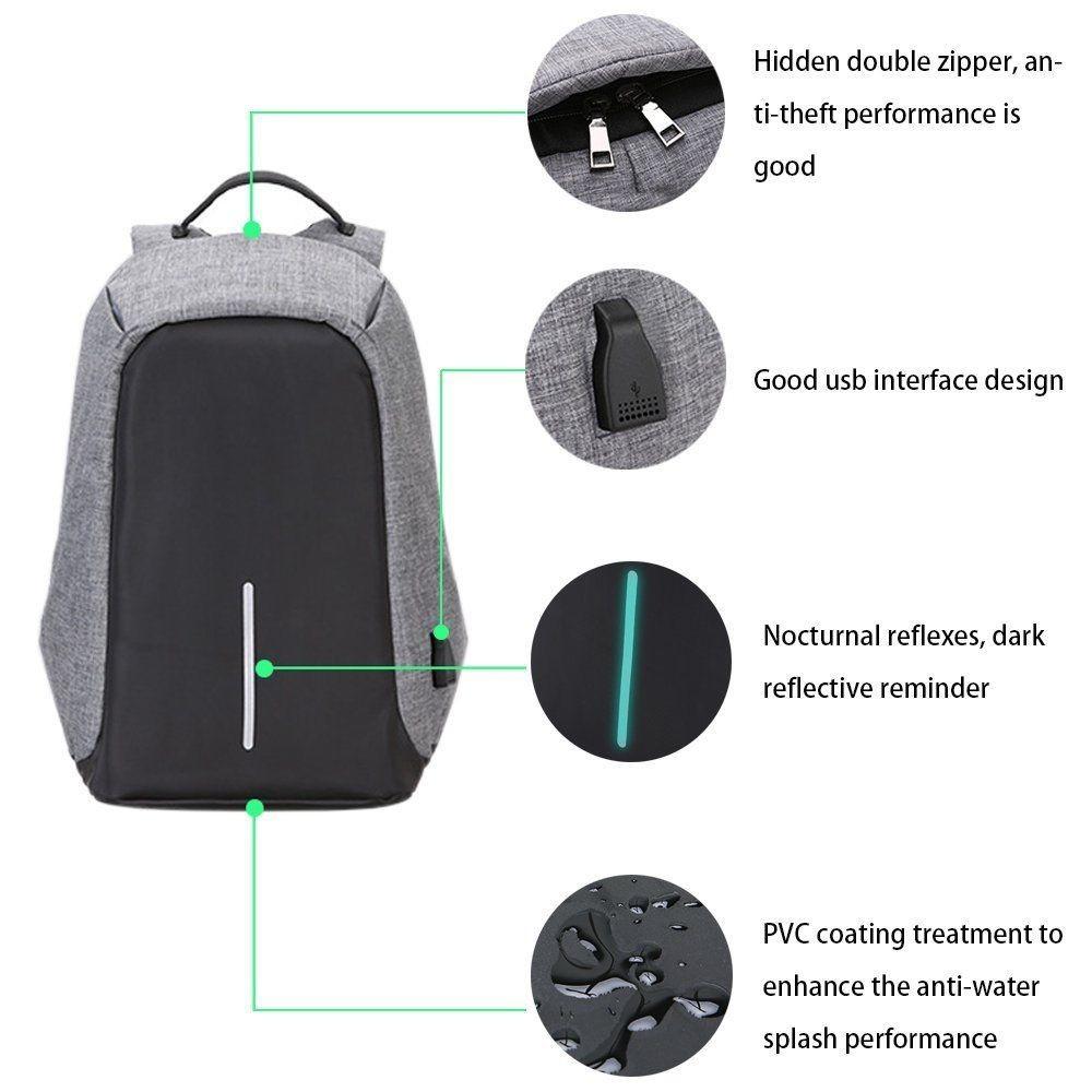 A Mochila Anti-roubo com Cabo USB está equipada com muitos bolsos e compartimentos, incluindo dois bolsos para o portátil ou tablet, com tiras elásticas para a sua proteção e um bolso interior lateral escondido. Na parte exterior lateral da mochila está localizada uma porta USB que lhe permite ligar o seu carregador portátil favorito (um cabo USB está incluído) e carregar os seus dispositivos eletrónicos, enquanto se desloca a pé para qualquer lado.