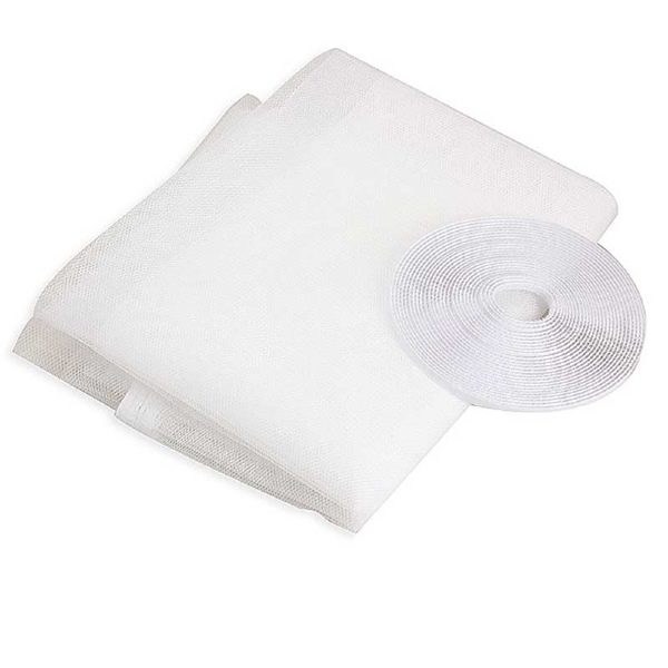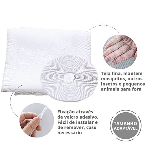 Tela protetora contra mosquitos e insetos, de fácil instalação e remoção. Feita de poliéster, material leve e flexível e que pode ser lavado.