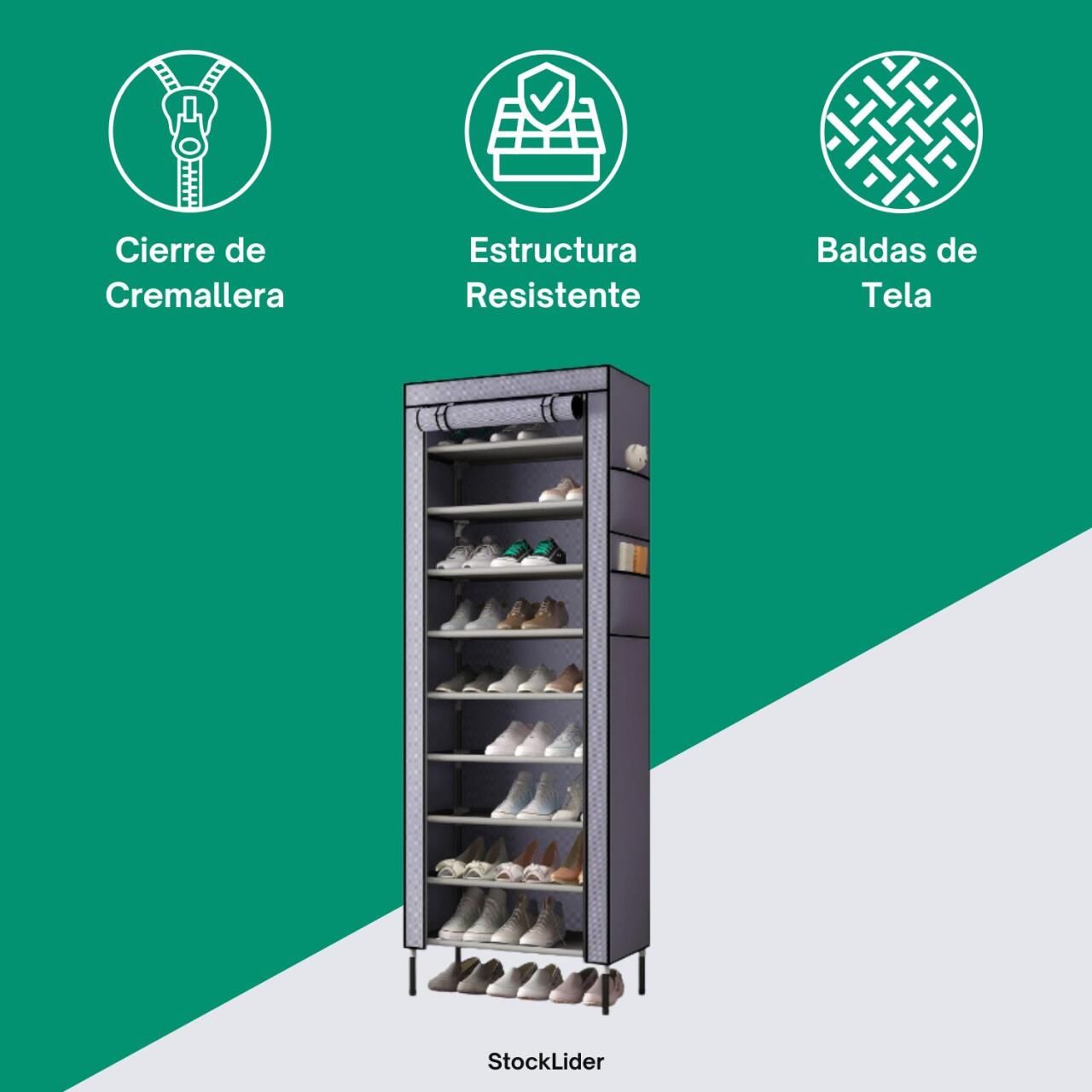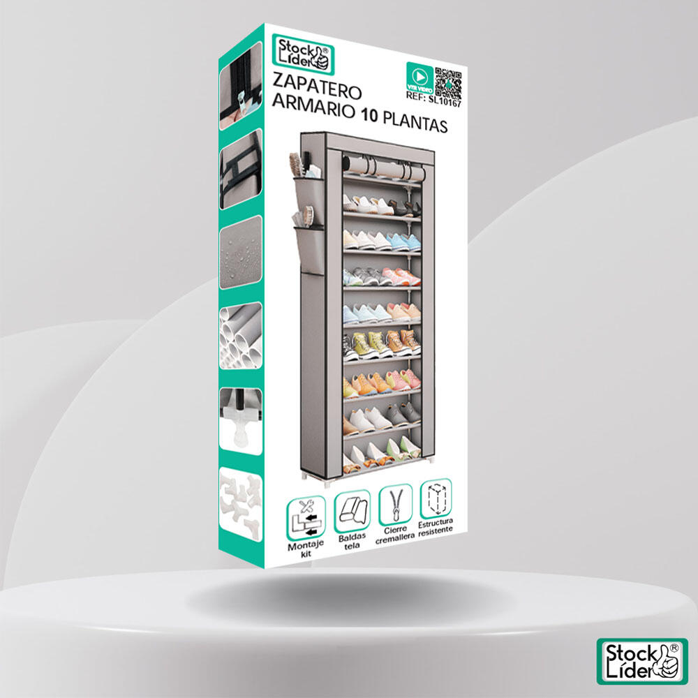 Inclui capa protetora em tecido leve e higiénico, com porta de velcro e fecho frontal enrolável, que protege os sapatos do pó, insetos e humidade, mantendo-os em perfeitas condições. A montagem é rápida e simples, sem necessidade de ferramentas – basta encaixar as peças e em poucos minutos terá a sapateira pronta a usar.