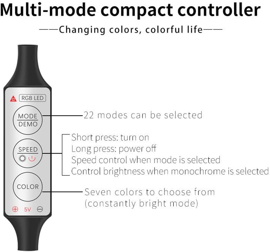 Controla facilmente através de comando remoto: ligar/desligar, ajustar brilho, velocidade dos efeitos e escolher entre 22 modos de luz predefinidos.