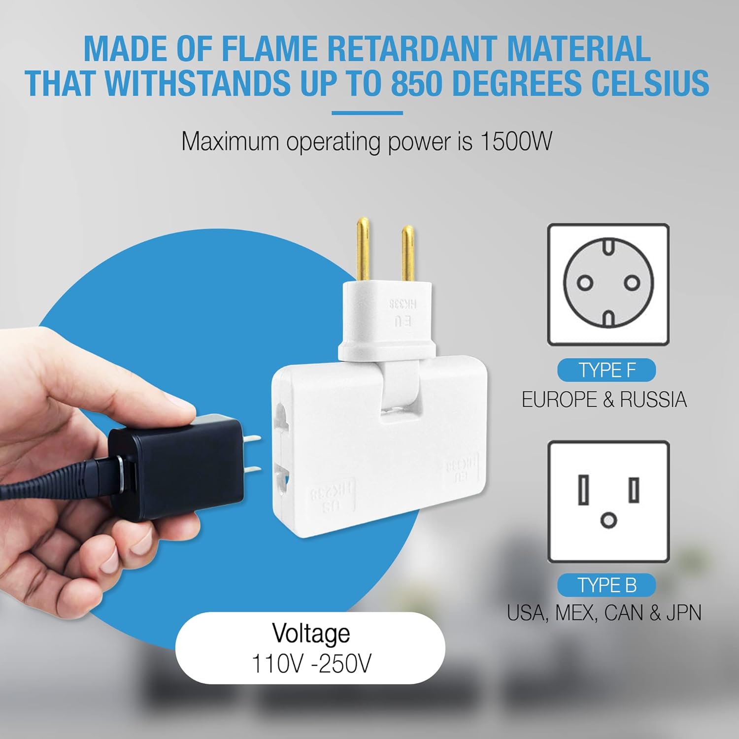 Segurança garantida: Fabricado com material retardador de chamas que suporta temperaturas de até 850ºC, e com uma tensão máxima de 250V, corrente de 10A e potência máxima de 1500W. Este adaptador oferece um carregamento seguro e fiável para os seus dispositivos.